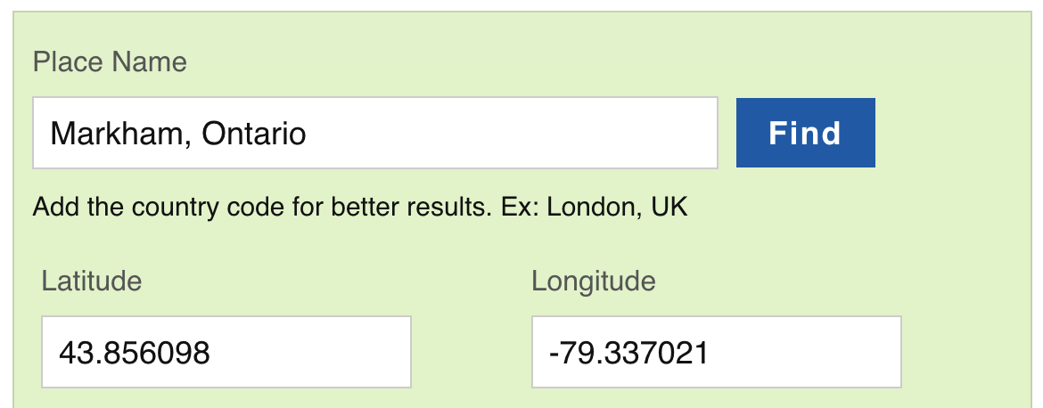 In my example, Markham, Ontario translates to Latitude 43.856098 and Longitude -79.337021