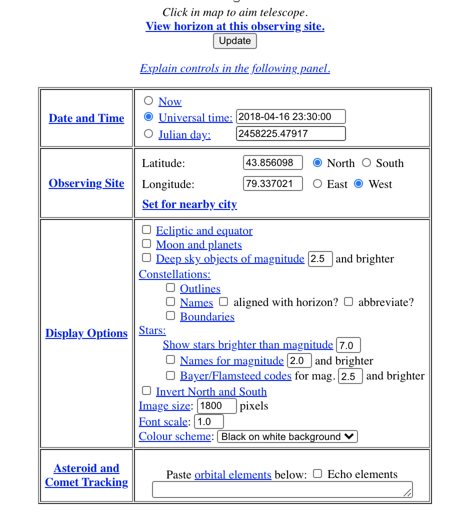 Go to https://www.fourmilab.ch/cgi-bin/Yoursky - this is a free option I found to generate the night sky. You should see something like this. Next we will go through all the inputs together.